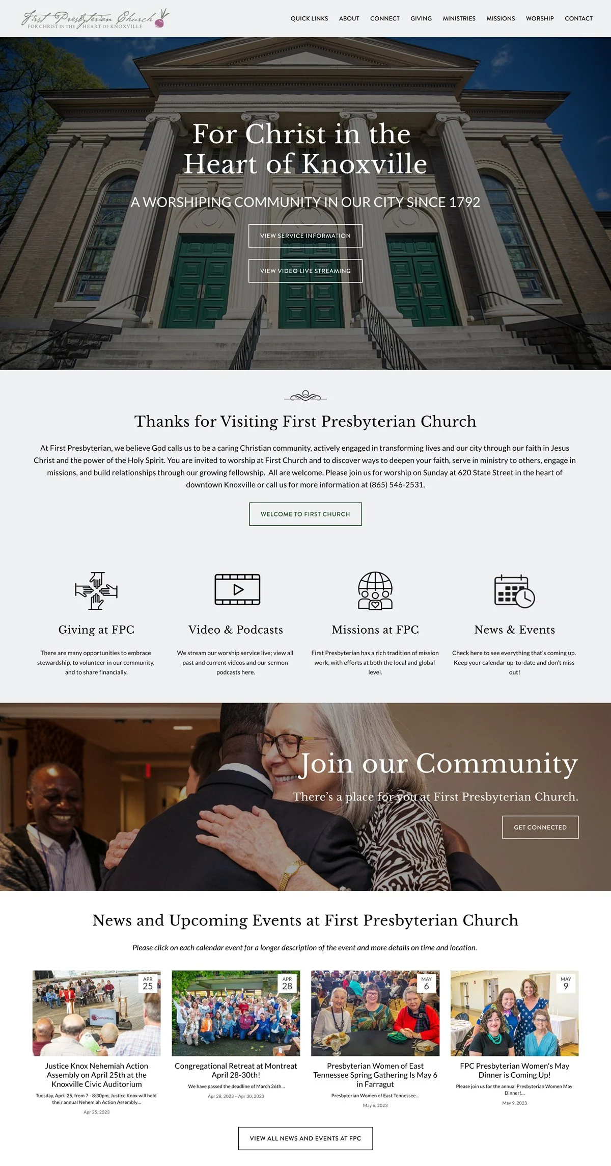 We built a dynamic website that told the story and history of First Presbyterian while reflecting its vitality and future that tripled in web traffic and engagement. We developed energetic newsletters that went out each week and displays of photographs throughout the church. We launched successful ad campaigns on social media and worked with media outlets to be featured multiple times on WBIR news, the Knoxville News-Sentinel and Knox TN Today.